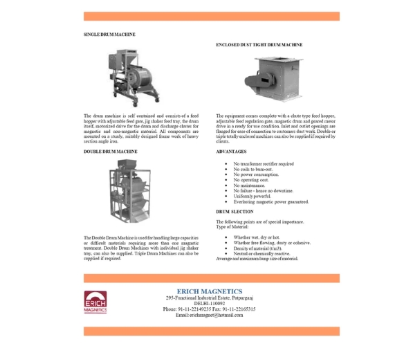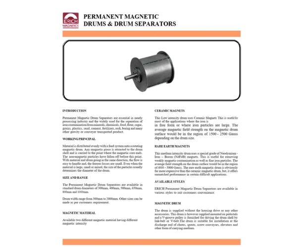 Erich Permanent Magnetic Drum Separators are ideal for chemical and mineral processing industries, efficiently sorting mineral particles and removing ferrous contaminants. Built with high-quality permanent magnets, they retain their magnetic strength over years of use. Available in various dimensions to meet diverse industrial requirements, these drum separators provide reliable and long-lasting performance.